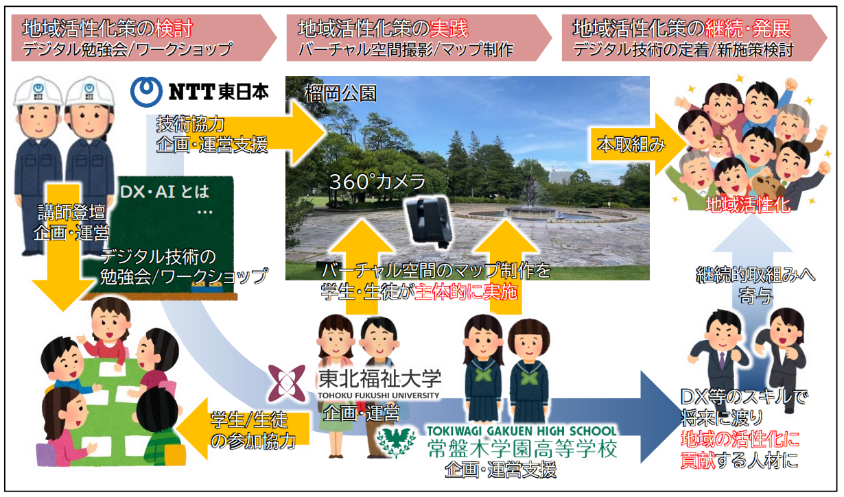 また、近隣の学生・生徒が主体的に取組みに関わることで、地域の若者の視点を取り入れて地域活性化を目指せるだけでなく、NTT東日本の社員が講師となって学生・生徒向けの勉強会等を開催することで、最新のデジタル技術を学べる機会として位置づけ、地域の将来を担うデジタル人材の育成にもつなげてまいります。大学生と高校生が、民間企業と協力して実際のデジタルアーカイブ撮影や今昔マップの作成を題材に、地域活性化とデジタル技術習得を目指す取組みは、東北初※1となります。