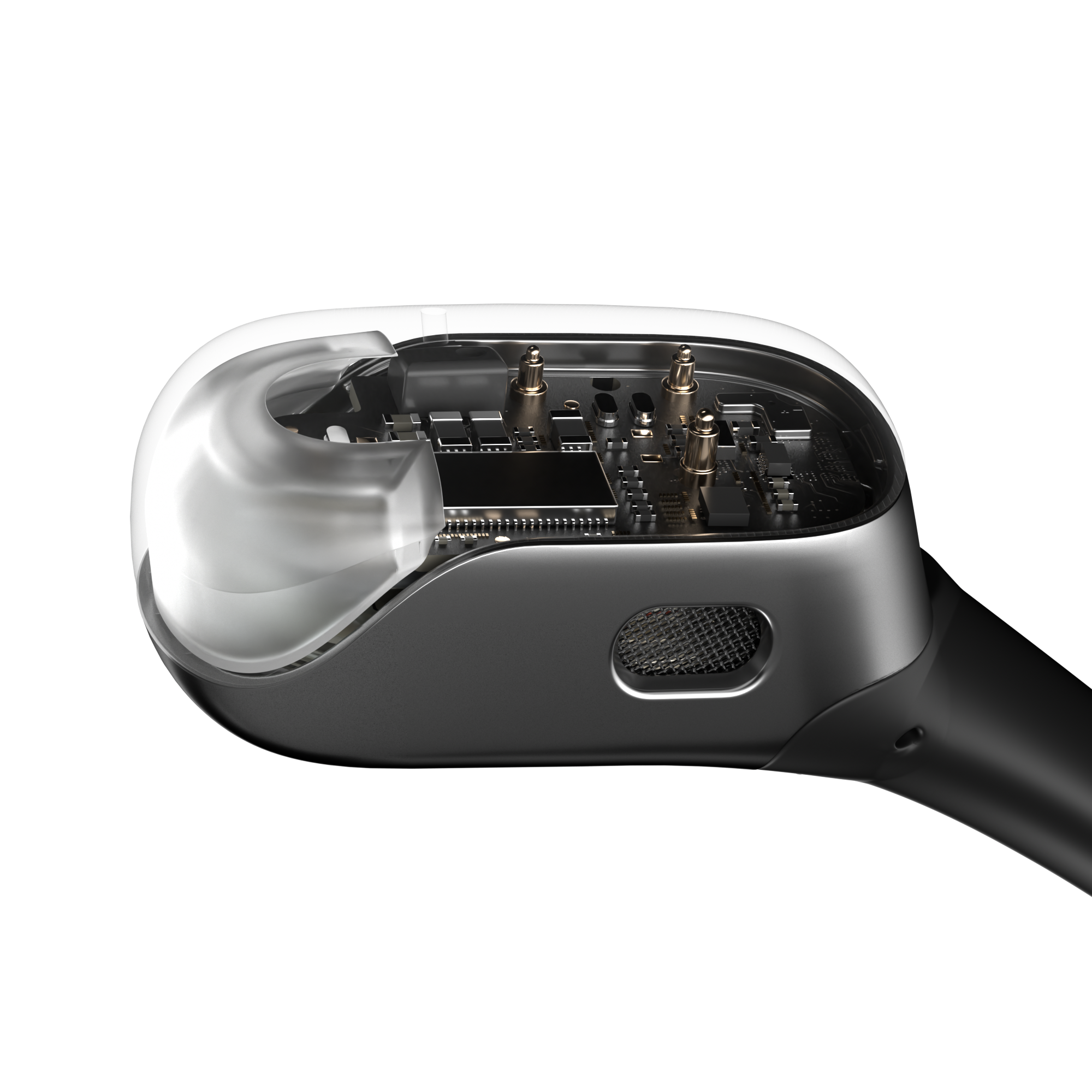 特徴は⼈間⼯学に基づいて設計されたドルフィンアークイヤーフックです。0.7mmの超極細な耳の形状を記憶する素材が内蔵されたデザインで、⽿の形に⾃然に優しくフィットしつつ、確実なグリップ⼒を感じることができます。