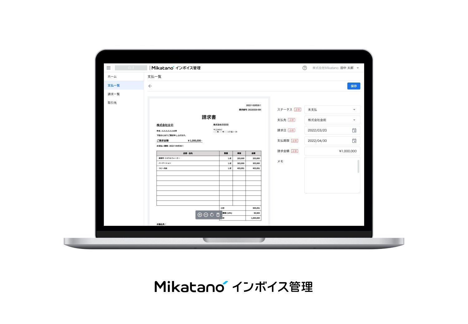 『Mikatano インボイス管理』は、金融機関を通じて、金融機関の顧客に当社が提供する、請求書管理サービスです。顧客は、発行・受領した紙の請求書のスキャンデータを『Mikatano インボイス管理』上にアップロードするだけで、請求金額や支払期限など請求書に記載されている内容が自動でデータ化されるため※、手入力での転記の負荷が少なく請求書を簡単にデータ化でき、一元管理が可能になります。2023年中を目途に改正電子帳簿保存法への対応も行う予定です。