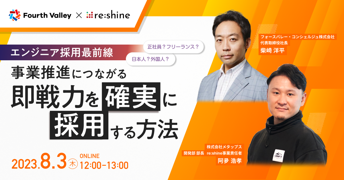 ITエンジニアの人材不足が深刻化する中、優秀で即戦力になるエンジニアを必要なタイミングで採用することが難しくなっています。しかし、フリーランスや副業、そして世界に目を向ければ、即戦力エンジニアを採用できる可能性が比較的高くなります。そこで今回は、グローバル採用支援事業を手掛けるフォースバレー・コンシェルジュ株式会社の柴崎氏と共に、国内外のエンジニア採用のトレンドや開発組織を支える即戦力エンジニアの採用戦略について事例を交えてお話します。