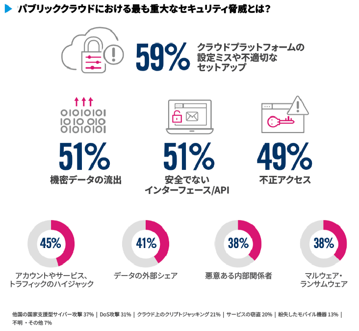 最大の課題:最も重大なセキュリティ脅威に位置付けられたのは、クラウドプラットフォームの設定ミスや不適切なセットアップ(59%)であり、機密データの流出(51%)、安全でないインターフェース/API(51%)、不正アクセス(49%)が続きました。