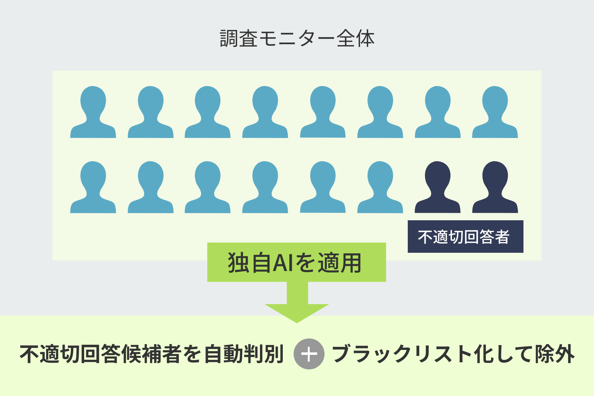 Freeasyでは、調査モニターの品質管理を徹底しています。具体的には、Freeasyの調査モニターへ全数調査を行い、回答データに今回取得した特許である独自のアルゴリズムを適用して、不適切回答候補者を自動判別・抽出し、ブラックリスト化。排除することで、クリーニングされた調査モニターへWeb調査を行うことを可能にしました。