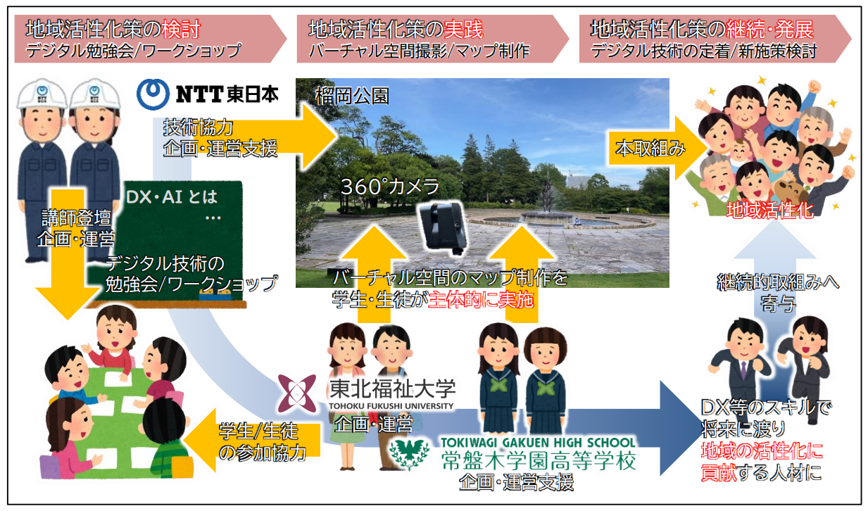 また、近隣の学生・生徒が主体的に取組みに関わることで、地域の若者の視点を取り入れて地域活性化を目指せるだけでなく、NTT東日本の社員が講師となって学生・生徒向けの勉強会等を開催することで、最新のデジタル技術を学べる機会として位置づけ、地域の将来を担うデジタル人材の育成にもつなげてまいります。大学生と高校生が、民間企業と協力して実際のデジタルアーカイブ撮影や今昔マップの作成を題材に、地域活性化とデジタル技術習得を目指す取組みは、東北初※1となります。