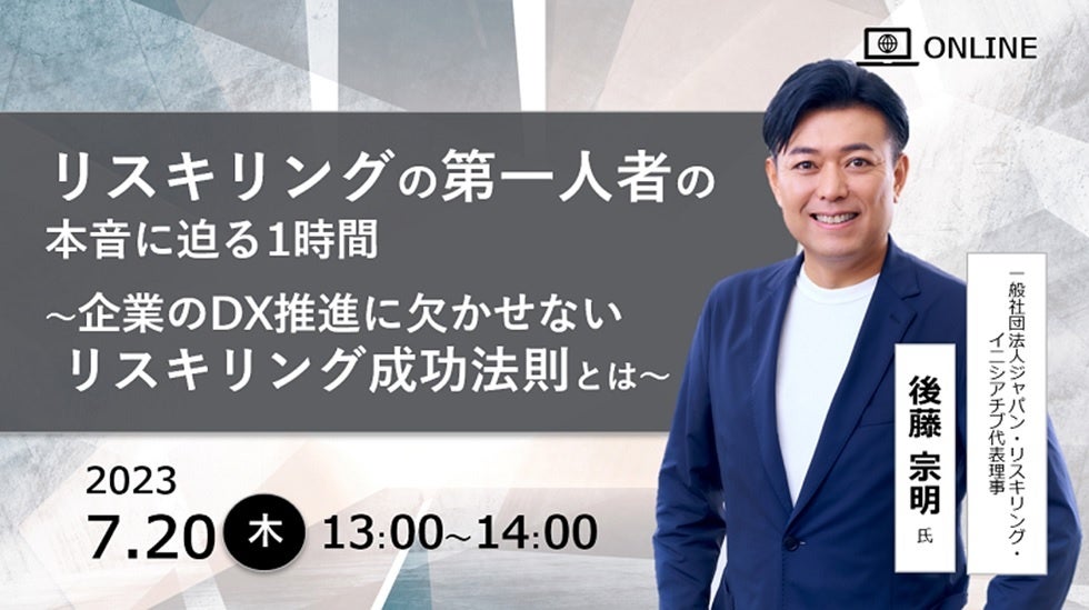 「DX推進におけるリスキリングをしたくても、具体的に何をどうすればよいのかわからない」という方のために、今回は、ジャパン・リスキリング・イニシアチブ代表理事であり、著書「リスキリング」が多方面で注目を高め、リスキリングの第一人者である後藤宗明氏とセミナーを開催します。企業のDX推進に欠かせないリスキリングの「成功法則」のみならず、パネルディスカッションでは、事例も紹介します。