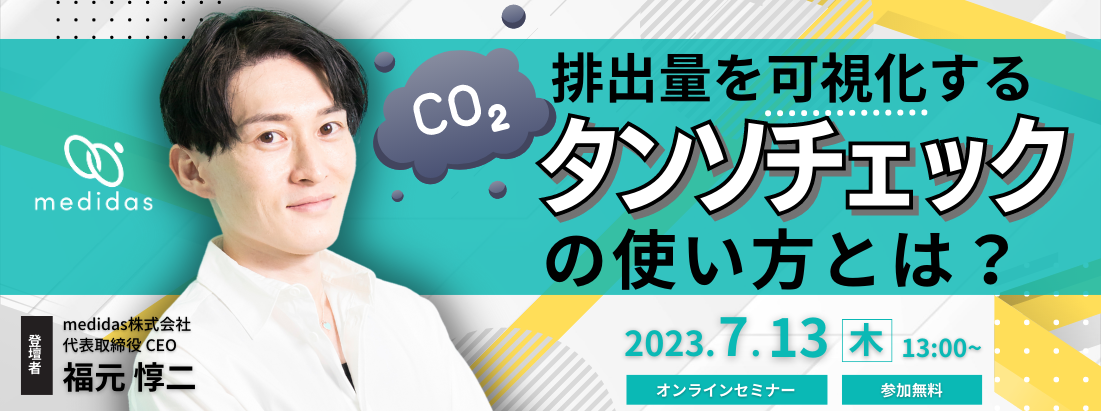 medidas株式会社(本社:大阪府大阪市、代表取締役社長 福元惇二)は、2023年7月12日(木)13時から、無料オンラインセミナー“CO2排出量を簡単に見える化できる「タンソチェック」の操作方法は?脱炭素経営セミナー”を開催します。