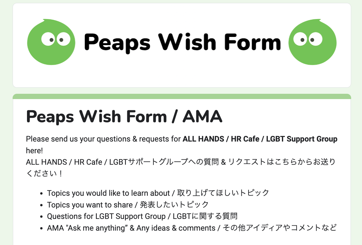 意見箱のようなもの。Company All Handsで取り上げたいトピックや経営陣への質問、会社へのリクエストを投稿するリクエストフォーム。匿名でも受付可能となっています。
