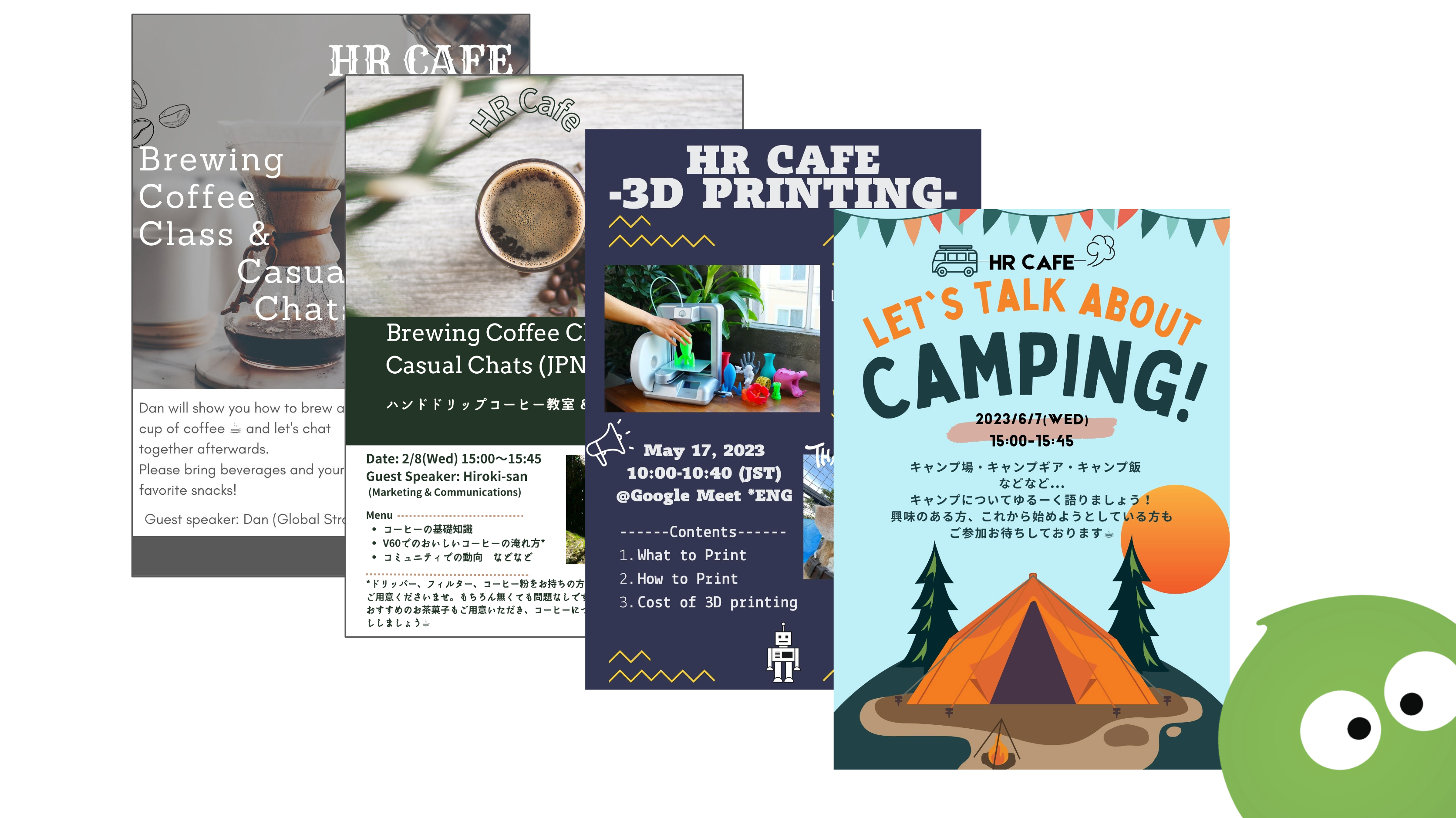 Peapsの仕事以外の特技(タレント)について話せるセッションを開催。セッションは少なくとも月1回、業務時間内に英語または日本語で行われ、コーヒーの挿れ方、キャンピング、3Dプリンティングなど、毎回異なるテーマのもと、興味のあるPeapsが自由に集まり、気軽に話す場となっています。趣味に関するテーマだけでなく、3月8日の「国際女性デー」ではテーマを決めて意見交換するなど、リクエストやイベントに応じてテーマを設定。また、新型コロナウィルス感染症における行動制限の緩和後には、イベントスペースを使用して、オンサイト(オフライン)で交流できる機会を設けました。