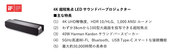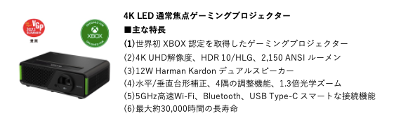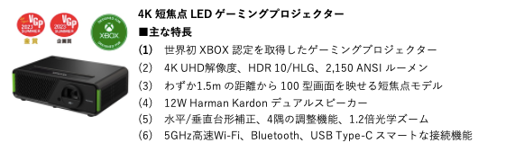 受賞理由:わずか約1.51mの距離から100インチ大画面を表示できるゲーミングプロジェクターに対して。