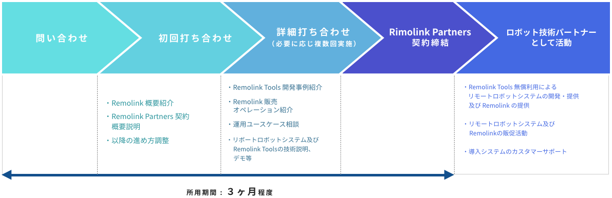最初のお問い合わせより約3か月前後でRemolink Partners参画企業として活動頂けます。