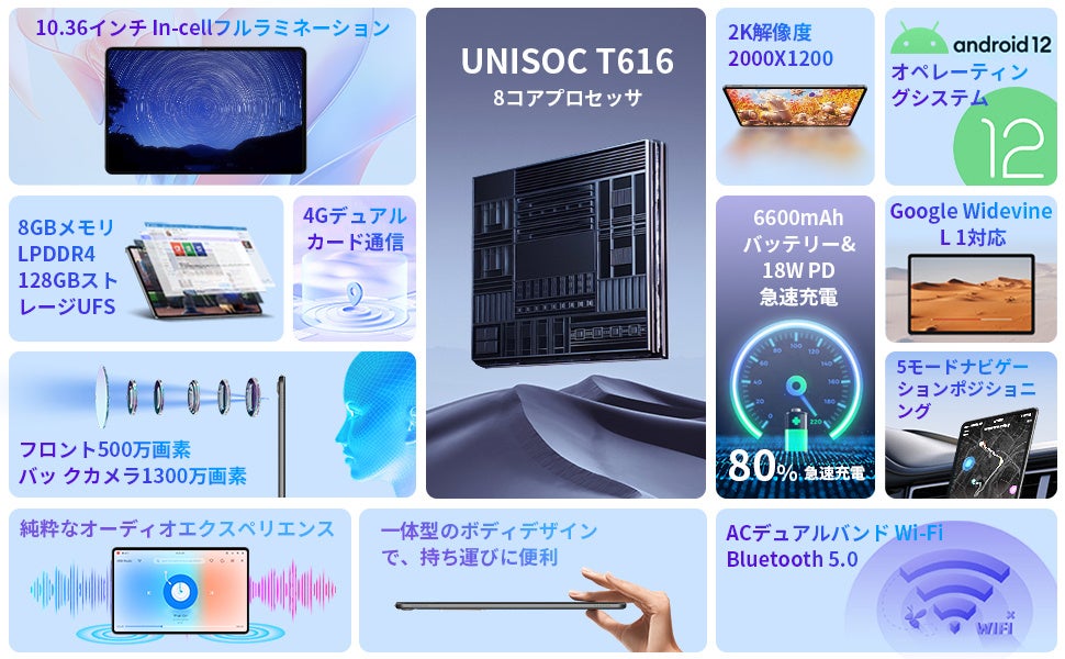 UNISOCの高性能T616、8コア2.0Ghz CPU搭載で、低消費電力で高速な処理が可能です。グラフィックス処理も強化され、ゲームや動画をよりスムーズにお楽しみいただけます。