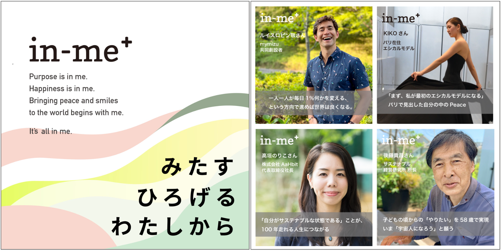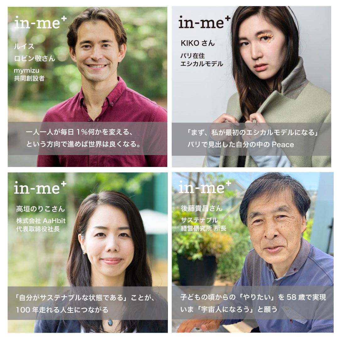 「in-me+」 の発信を通して、一人の優れた活動家だけでなく、「普通の私たち」が「ジブンを満たす生き方」を実践していくことを広めるムーブメントを創り出していきます。