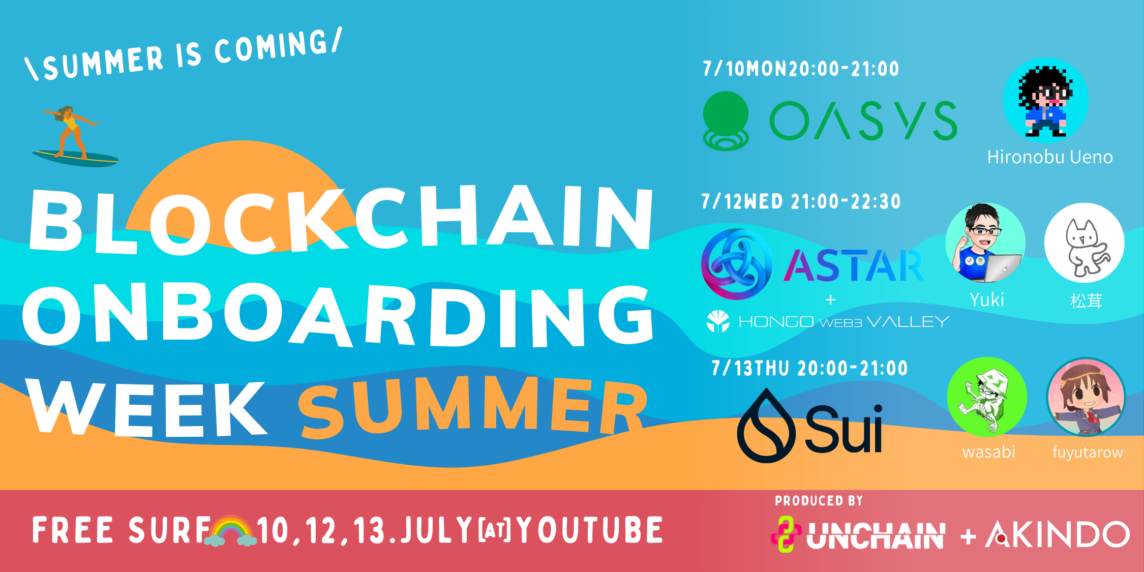 Blockchain Onboarding Week SummerはAKINDOとUNCHAINによる、新鋭のブロックチェーンを学ぶエンジニアのための1週間に及ぶオンライン勉強会プログラムです。AKINDOとUNCHAINのパートナーシップ連携におけるファーストムーブとなり、7/10(月)はOasys、7/12(水)Astar、7/13(木)Suiという話題のブロックチェーンを1週間を通して各チェーンに携わるエンジニアから直接、かつ網羅的に学ぶことができます。