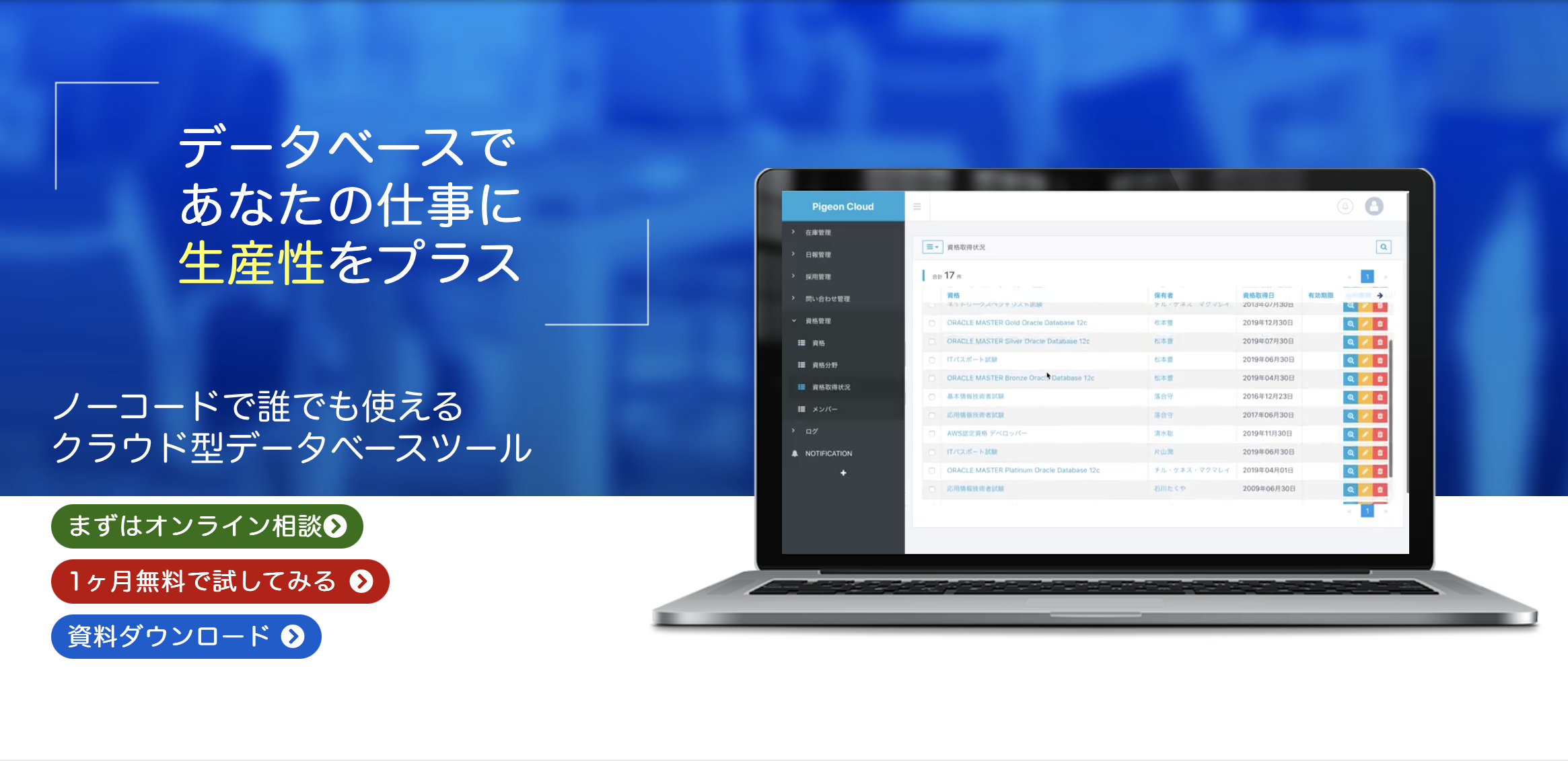 代替、移行先のサービスとして公式で「サイボウズOffice」や「kintone」が案内されていますが、「デヂエ」の移行先の1つとしてロフタルがおすすめしているのが「PigeonCloud(ピジョンクラウド)」です。