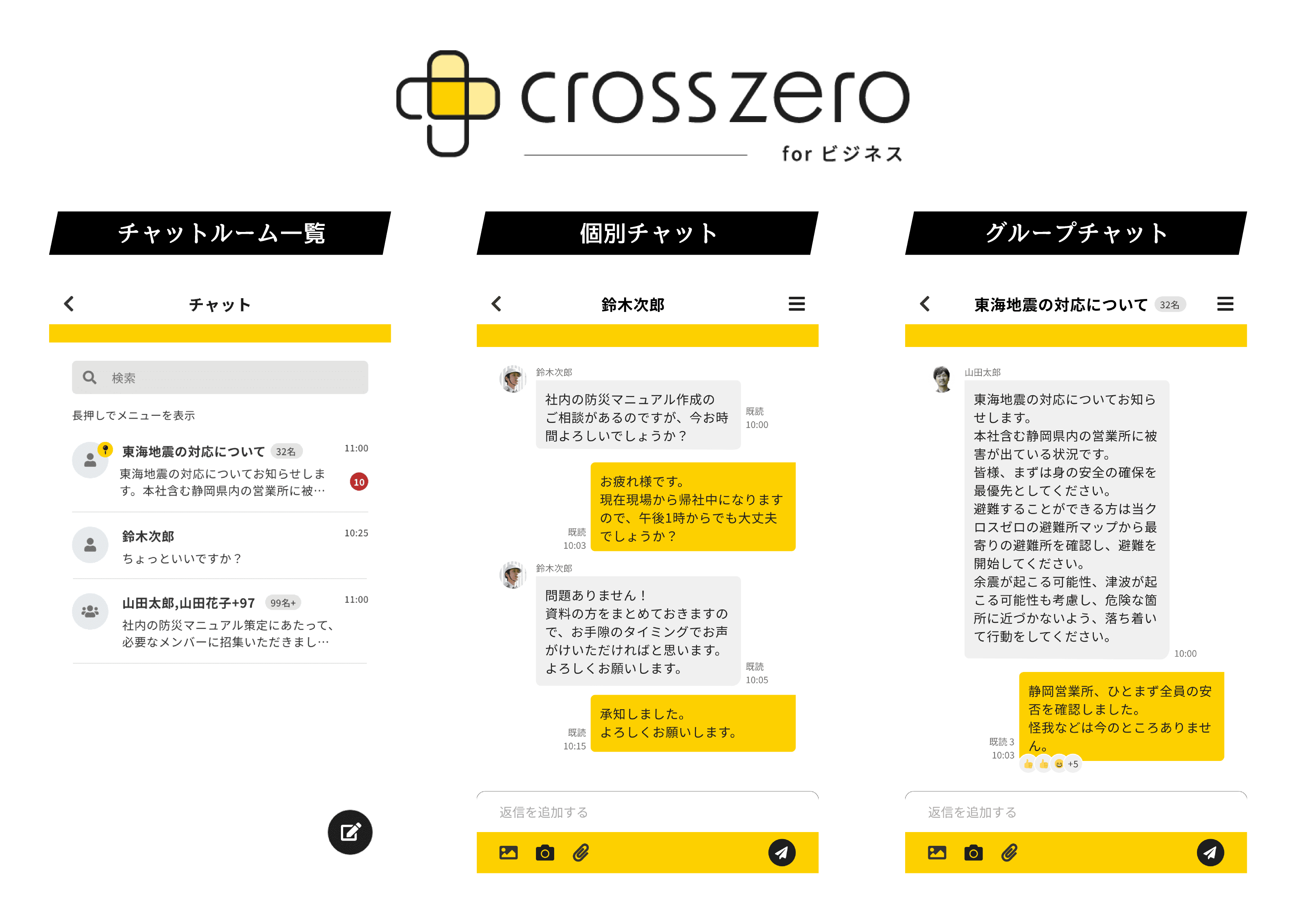 防災に関するマニュアル、避難経路や緊急連絡先等の書類の管理や、発災後の被害状況や情報伝達等にご活用いただけます。有事の際の連絡をクロスゼロで一元化できるので、見落としが少なく効率的に情報共有できます。