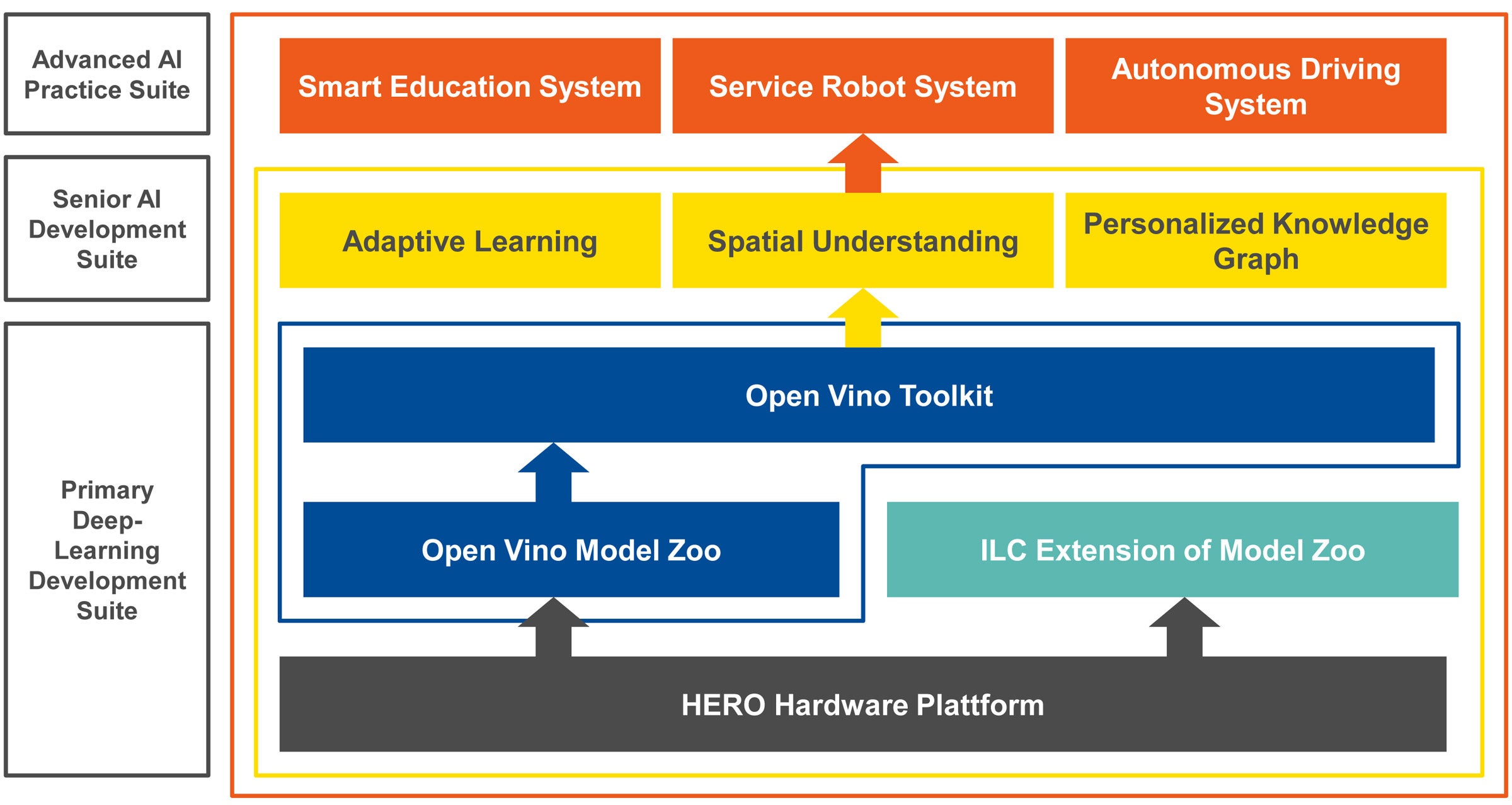 インテルラボ・チャイナはHERO教育キットに、コンピューティングのハードウェアのほかに、基本的な認識やインタラクション、ナビゲーション、プランニング、およびマニピュレーションのためのライブラリを含んだ、Advanced AI Practice Suiteを実装しました。オプションのSenior AI Development Suiteは、アダプティブ インタラクションと3Dセマンティックによるシーンの理解を含む、継続的な学習の機能を付加します。HEROプラットフォームは、必要に応じてさらに拡張することもできます。たとえば、ヘテロジニアス コンピューティングプラットフォームには、インテル Arria 10 GX FPGAの他、サードパーティのハードウェア アクセラレーションモジュールを組み込むことができます。アダプティブ ラーニングの部分は、追加の認識モジュールにより拡張することができ、実装されている認識機能を強化したり、新しい認識機能を追加したりすることができます。このようにして、ロボットは将来のミッションのさまざまな要件に、迅速かつ柔軟に適応することができます。さらに、モジュール化されたハードウェアにより、特定のアプリケーションにおける負荷とパフォーマンスのバランスを取ることもできます。