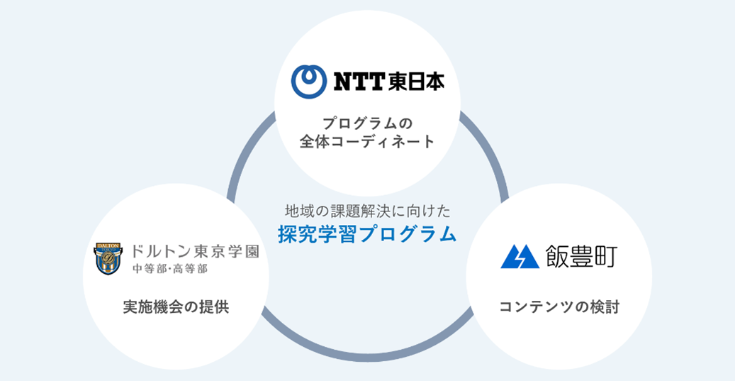 こうした背景のもと、この度、産官学それぞれの立場から「地域の課題解決」に取り組むNTT東日本、ドルトン東京学園及び飯豊町の3者が連携し、飯豊町をフィールドとした産官学連携による探究学習プログラムを実施することとなりました。