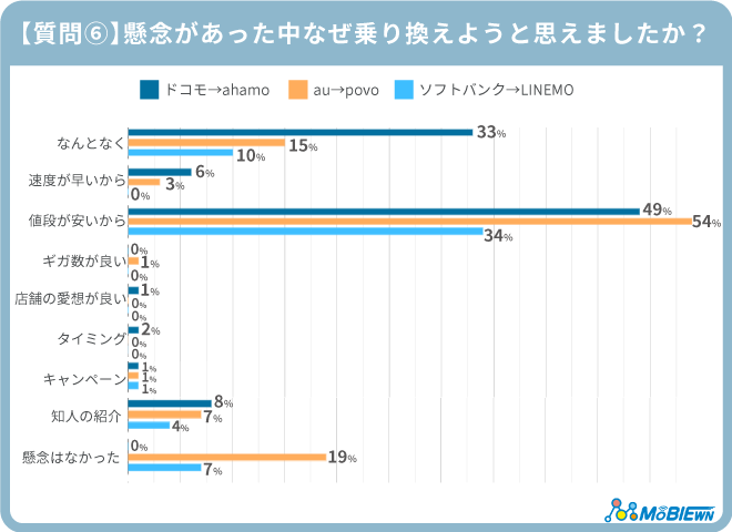 「懸念があった中なぜ乗り換えようと思えましたか?」という質問の回答は、どの大手から乗り換えた人も「値段が安いから」が1位でした。