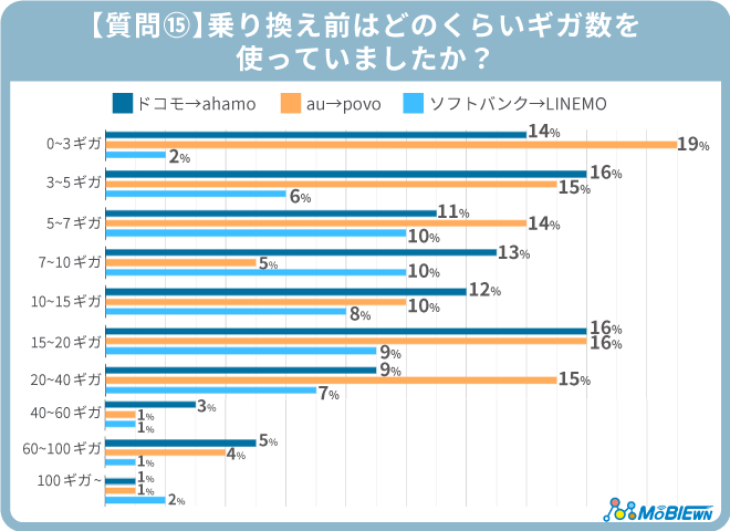 ・ドコモ→ahamo:「15~20ギガ」16.0%