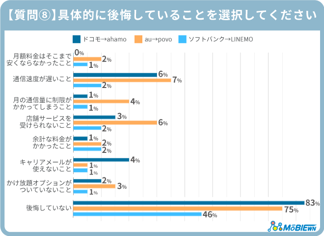 後悔している人の理由としては、どの大手から乗り換えた人も「通信速度が遅いこと」が多めです。