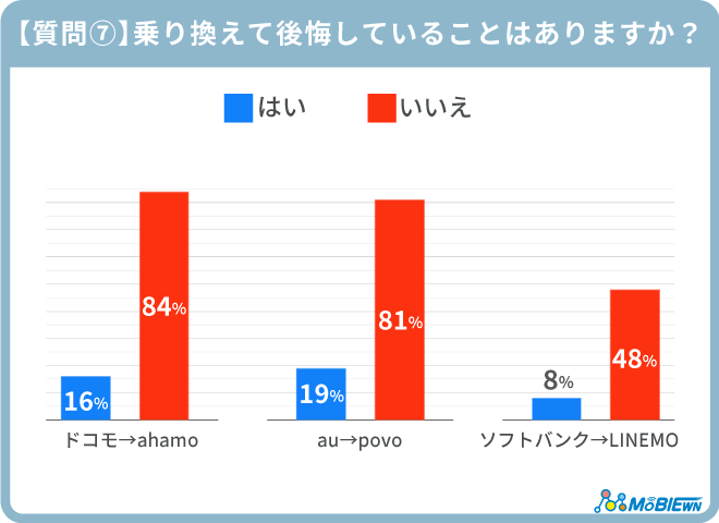 「乗り換えて後悔していることはありますか?」という質問には、どの大手から乗り換えた人も「いいえ」という回答が多くなりました。