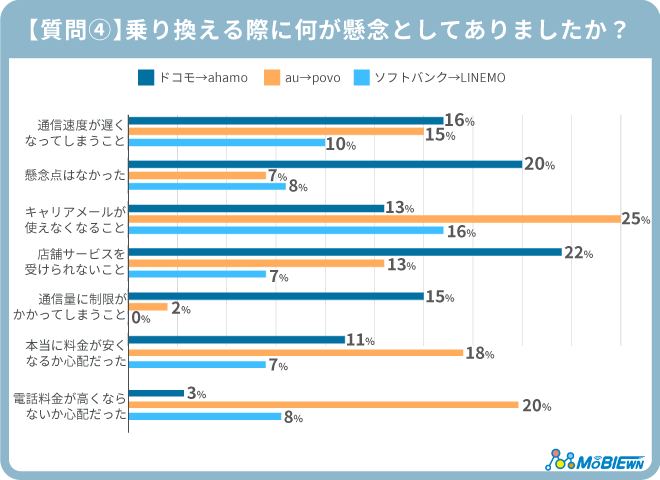 「乗り換える際に何が懸念としてありましたか?」という質問では、「キャリアメールが使えなくなること」が多めですが、回答にばらつきがありました。