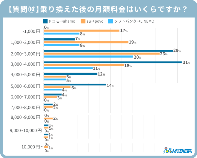 「乗り換えた後の月額料金はいくらですか?」という質問では、どの大手から乗り換えた人も「2,000~3,000円」が1位という結果になりました。