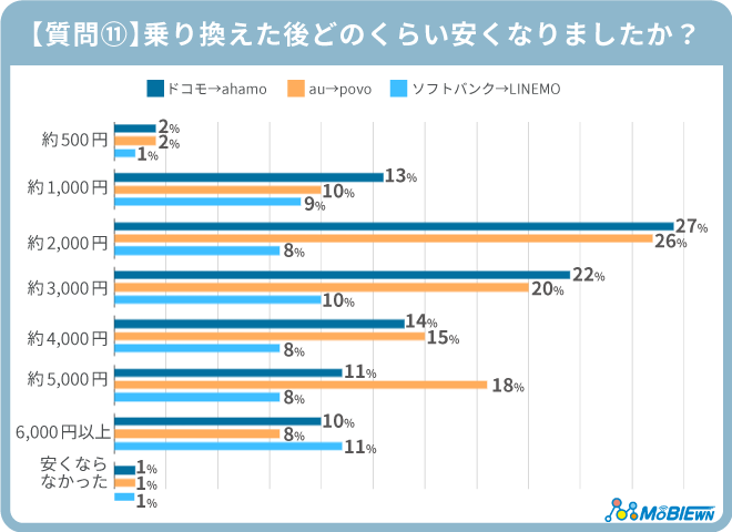 「乗り換えた後どのくらい安くなりましたか?」との質問では、「約2,000円」との回答が多めでした。