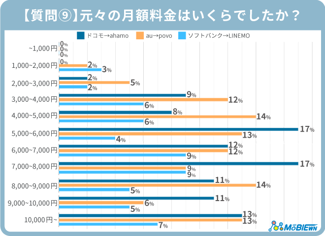 ・ソフトバンク→LINEMO:「6,000~7,000円」「7,000~8,000円」同率16.1%
