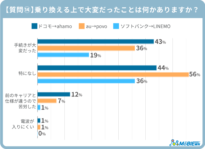 ドコモ→ahamoのみ、43.0%が「手続きが大変だった」を選んでおり、キャリアによって差が出ました。