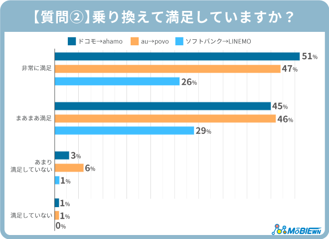 「乗り換えて満足していますか?」という質問では、「非常に満足」「まあまあ満足」と答えた人が9割以上という結果になりました。