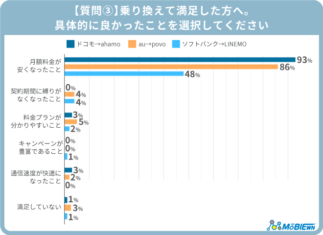 「乗り換えて満足した方へ。具体的に良かったことを選択してください」という項目では、「月額料金が安くなったこと」が1位でした。