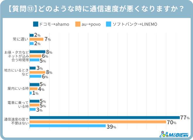 「どのような時に通信速度が悪くなりますか?」という質問では、キャリアごとに回答にばらつきが見られました。
