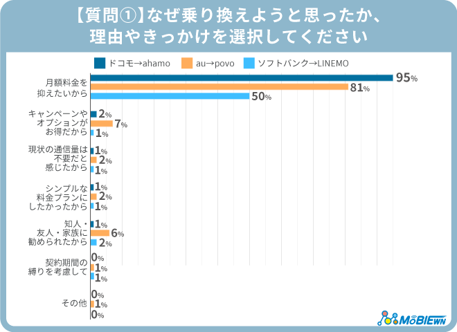 「乗り換えた理由やきっかけを選択してください」という項目では、「月額料金を抑えたいから」がダントツの1位でした。