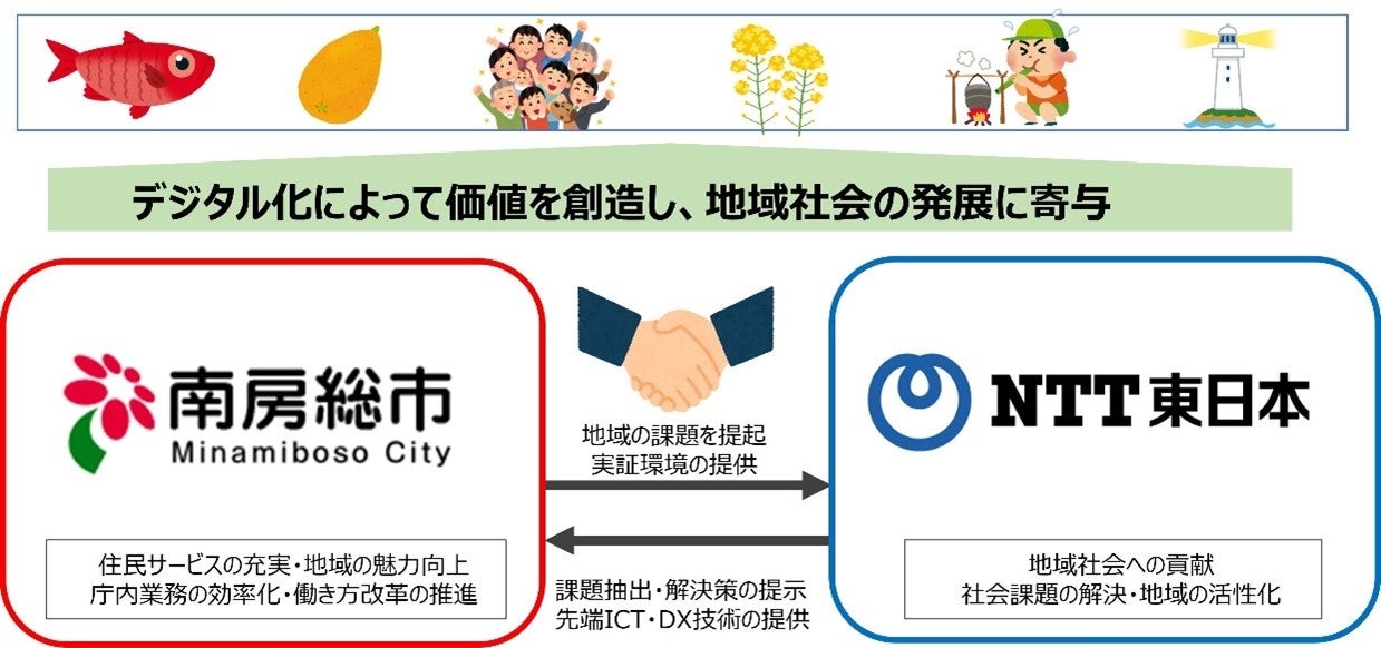 このたび、南房総市におけるさらなる地域の魅力向上に向けて、両者が協働してICTやDXの取り組みを通じて行政サービスの向上や働き方改革を推進し、課題解決を推進していくことで、デジタル化による価値創造及び地域社会の発展を実現するべく連携することといたしました。