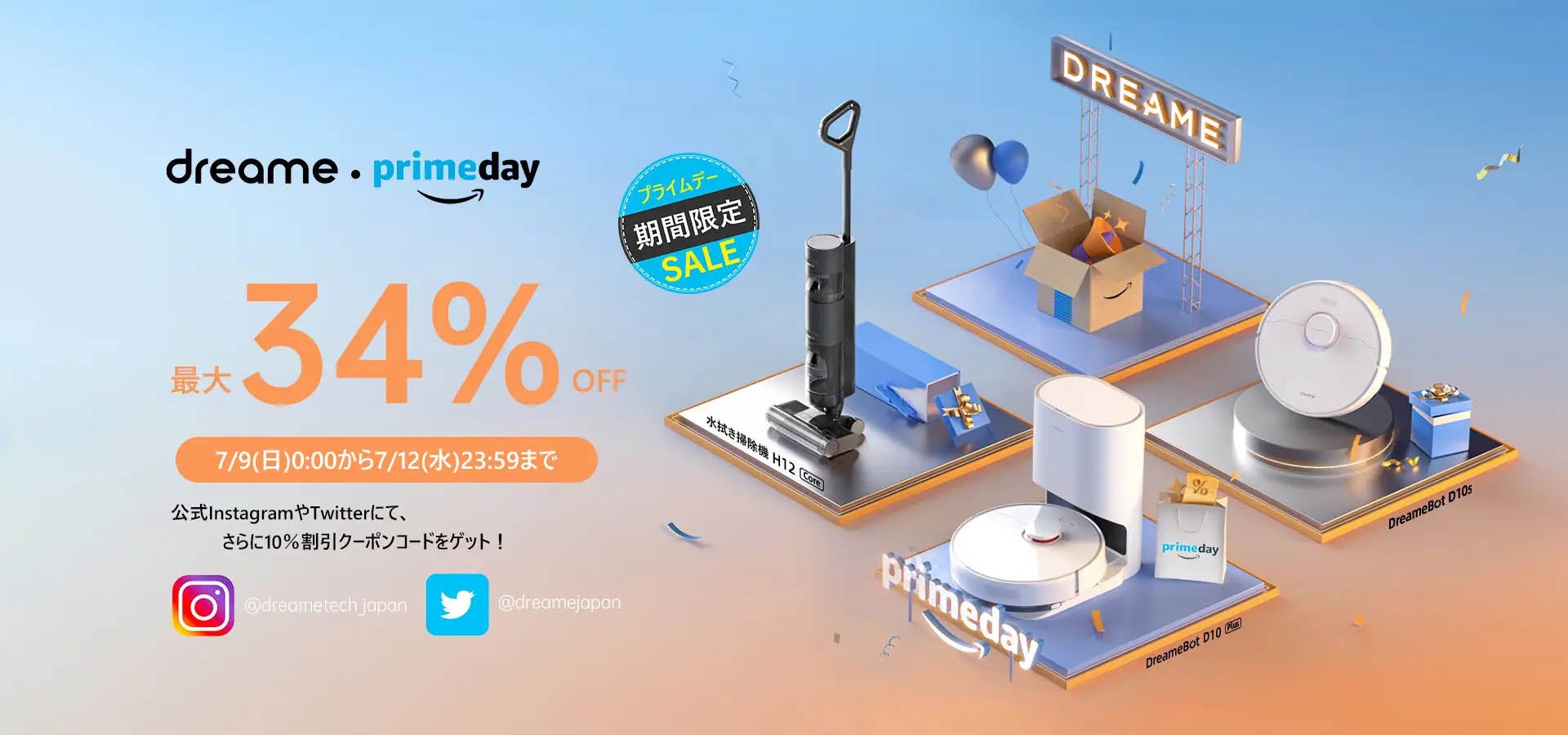シー・エフ・デー販売株式会社(社長:三谷弘次、本社:愛知県名古屋市)が代理店を務めますDreame Technology社(CEO:Yu Hao、本社:中国 蘇州)の水拭き対応ロボット掃除機と水拭き掃除機が、「プライムデー先行セール」期間を含む7月9日(日)00:00~7月12日(水)23:59の4日間にわたって開催される「Amazon プライムデー」におきまして、最大34%OFFとなります。