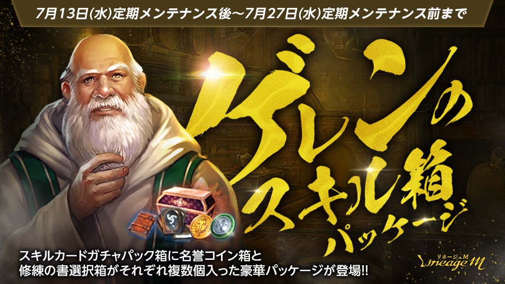 「スキルカードガチャパック箱(イベント)」3個と「ゲレンの名誉コイン箱」5個、「修練の書選択箱(イベント)」10個、「ゲレンの証」1個がセットになった「ゲレンのスキル箱パッケージ」が登場しました。