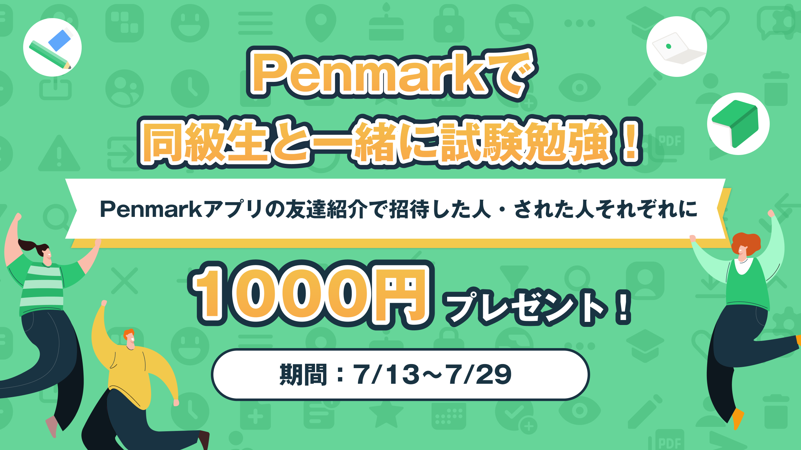この度、試験期間を迎える学生に向けて、「夏の試験勉強応援キャンペーン」を開始いたします。ペンマークアプリに招待する、または招待されると、抽選で300名様に「Amazonギフト券 1,000円分」が当たります。