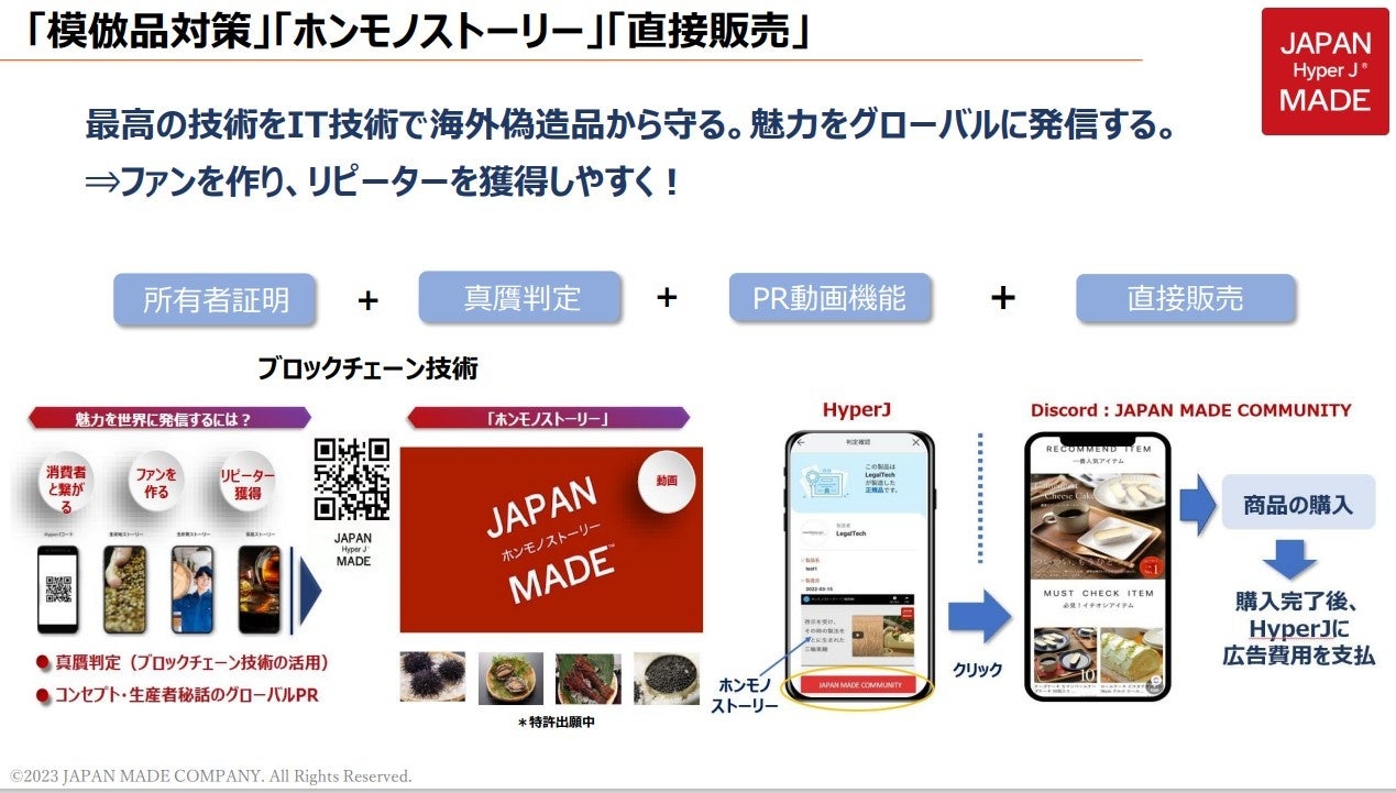 JAPAN MADE社が開発したブロックチェーン基盤のPR動画付き真贋判定システム『HyperJ』を、JAPAN MADE PASS ホルダー様がつくられた商品に付けることが可能になります。