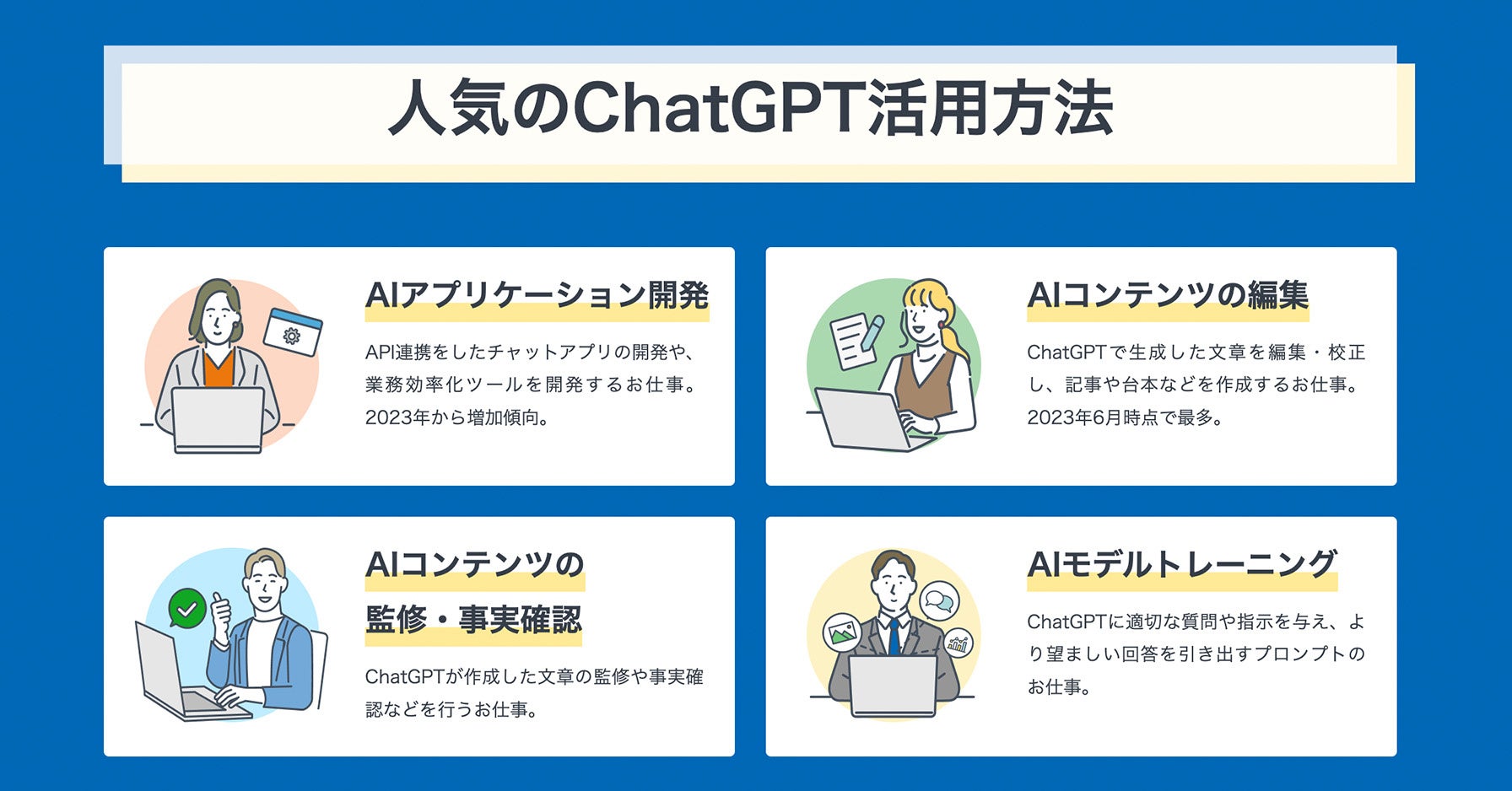 今回実装した特集ページでは、「人気のChatGPT活用方法」として代表的な4つの案件カテゴリを紹介しています。これらの仕事・案件に対応するワーカーとして、ChatGPT×開発、ChatGPT×ライター、AI×クリエイティブといったスキルから、実績のあるワーカーのラインナップもご覧いただけます。ぜひ、「ChatGPTのお仕事特集」ページをご覧ください。(URL:https://crowdworks.jp/static/lp/chatgpt_special_feature)