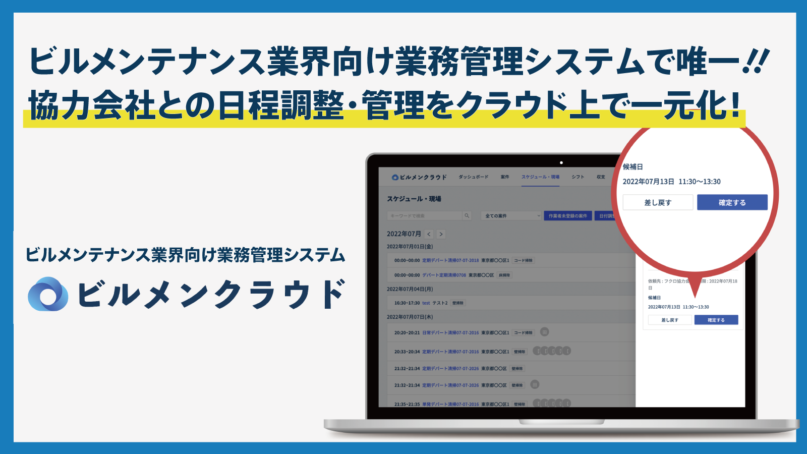 この度、ビルメンテナンス業界向け業務管理システムとして初(※1)となる、協力会社との日程調整機能を新たに追加しました。本機能の実装により、日程調整を起点に発生する経営課題や業務課題を解消し、業務コスト削減や品質低下の防止の実現をサポートします。