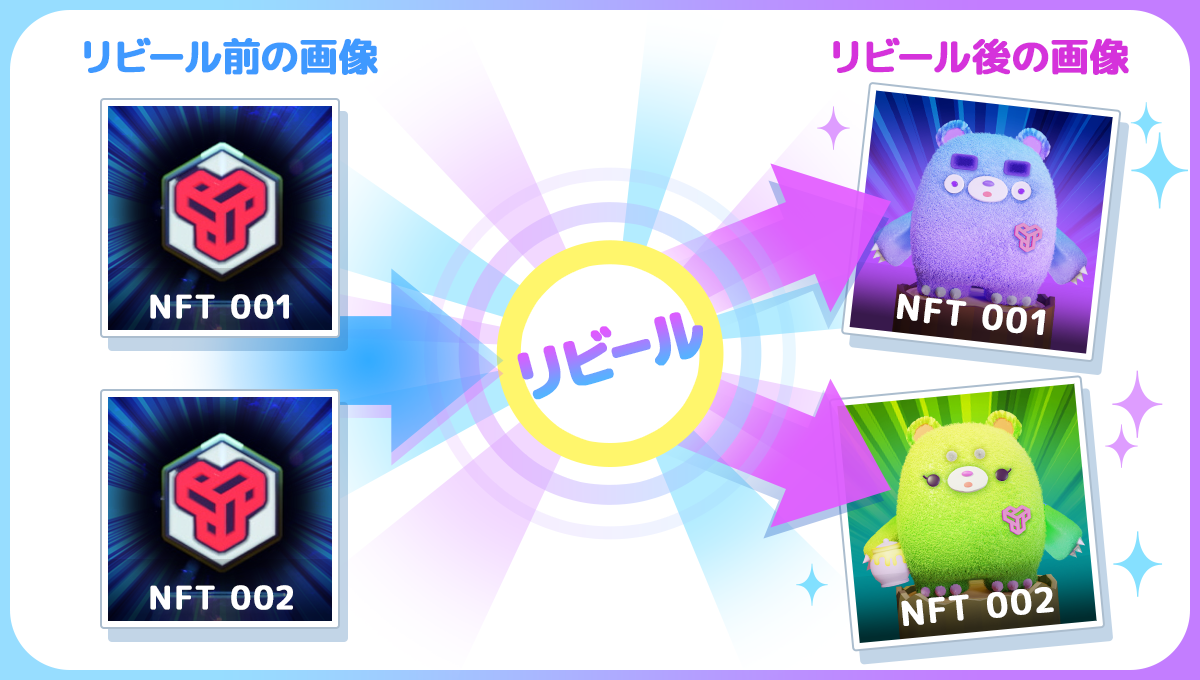 NFTのイメージ画像を予め指定した日時に自動的に変更する機能です。この機能を利用すると、NFTの販売前には同じイメージ画像を使用しますが、指定した日時を過ぎると個別に異なるイメージ画像に自動的に変更されて公開することができます。ユーザーにとって驚きを与え、より魅力的なNFT体験を提供することができます。