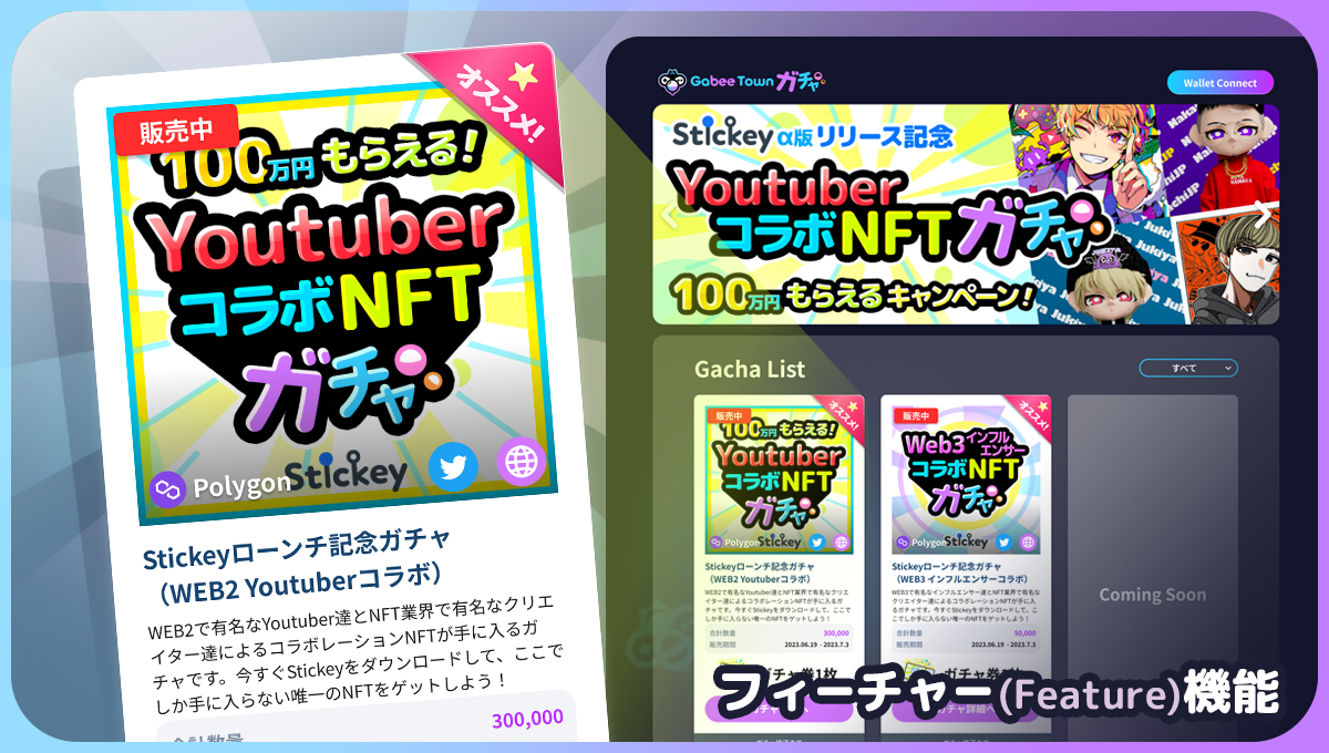NFTガチャ券は6月19日ローンチのweb3ウォレットアプリ『Stickey(スティッキー)』リリース記念プロモーションガチャで使用でき、NFTガチャ券を使用してNFTを獲得いただいた人の中から抽選で、Amazonギフト券300円、3,000円・現金100万円分を贈呈しております。