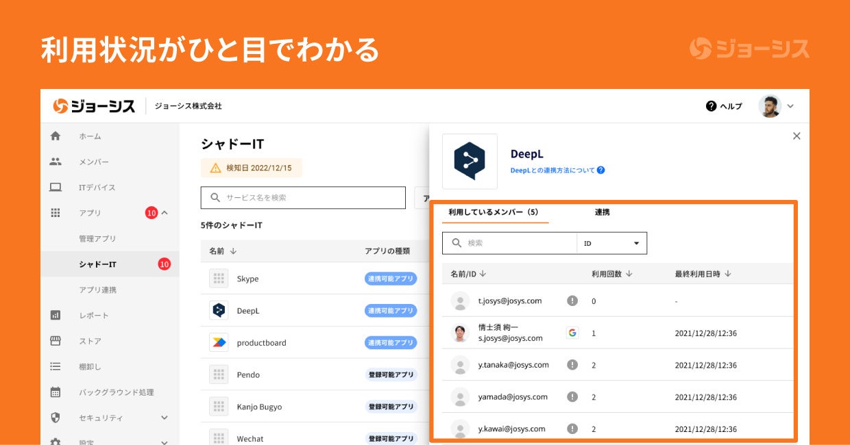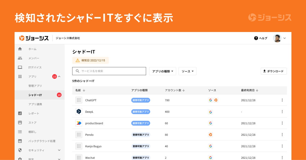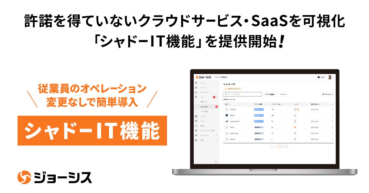 そこで「ジョーシス」では、従業員の業務オペレーションを変更せずに簡単にセキュリティ対策が可能になる「シャドーIT機能」を開発しました。これまで当社が提供してきた従業員に紐づけたITデバイス・SaaS台帳管理や入退社に伴うSaaSアカウント発行・削除、退職者の削除漏れアカウント検知機能を拡張したものです。従業員データを保有しているからこそ実現できる「誰が、何を使っているか」を可視化する機能です。