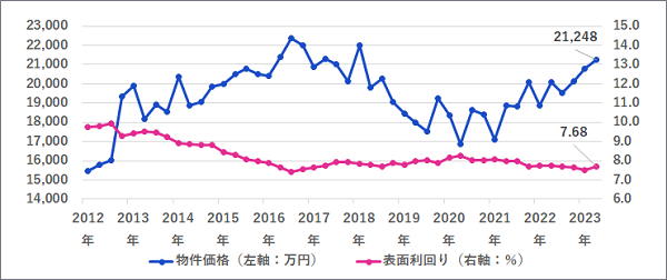 価格上昇の背景には、円安が加速したことや、低金利政策が続く日本の不動産市場に海外投資家が積極的に参入したことなどが考えられる。今後、日銀が金融引き締めに動いた場合には不動産価格が下落する可能性もあり、高止まりする不動産投資市況の行く末に注目が集まる。