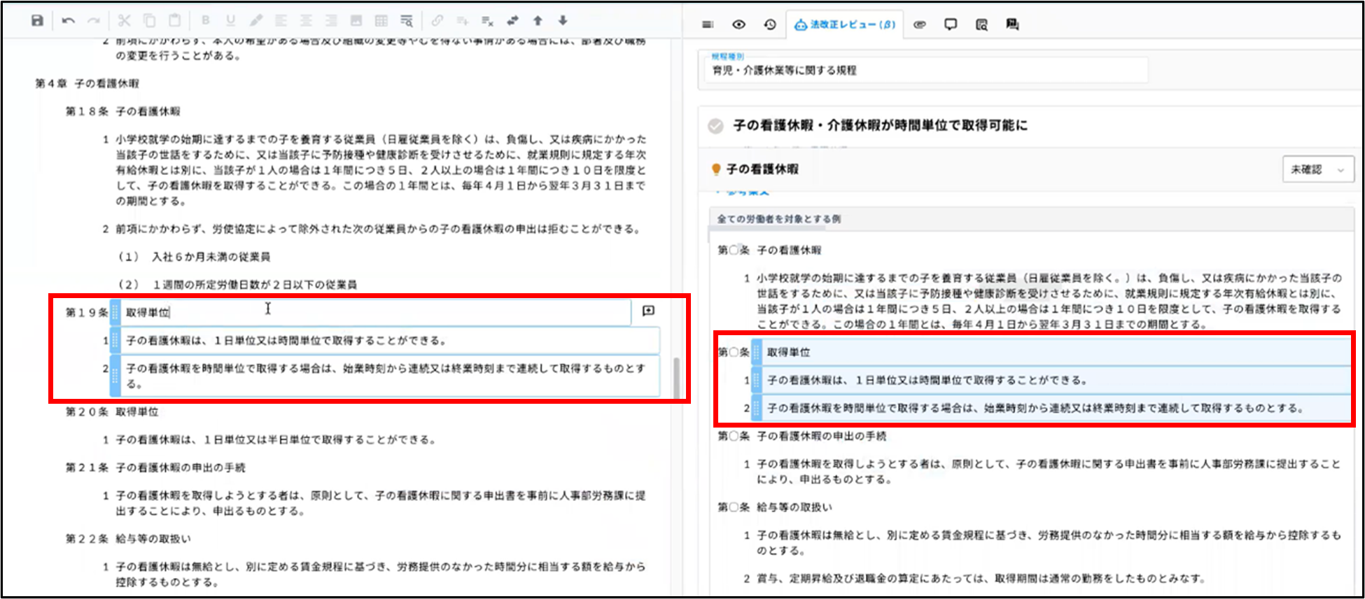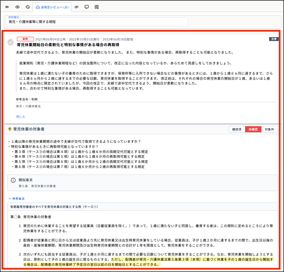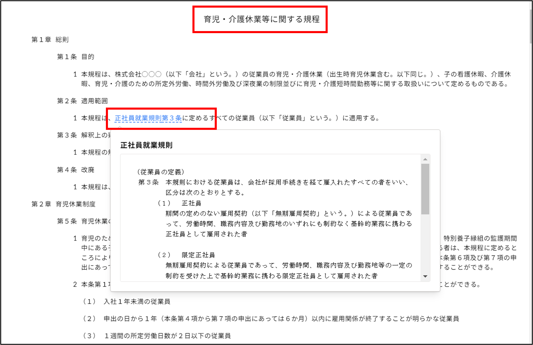 現在、本機能に対応している規程種別は「就業規則」、「育児・介護休業等に関する規程」の2種類で、順次拡大予定です。