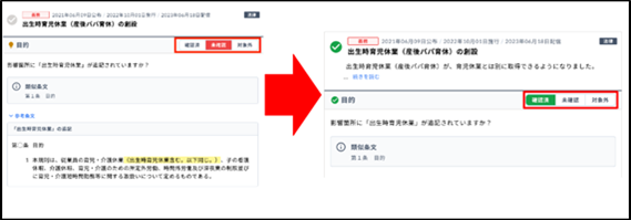 法改正情報を確認し、条文の修正を終えた→「確認済」にチェック