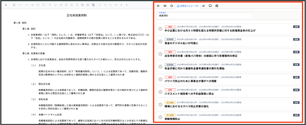 通常、法改正が施行した際には、法改正の内容や施行のスケジュールを担当者が理解した上で、運用している社内規程内のどこに修正が必要な条文があるのかを目視で探し、手作業で適した文言に改定する必要がありました。