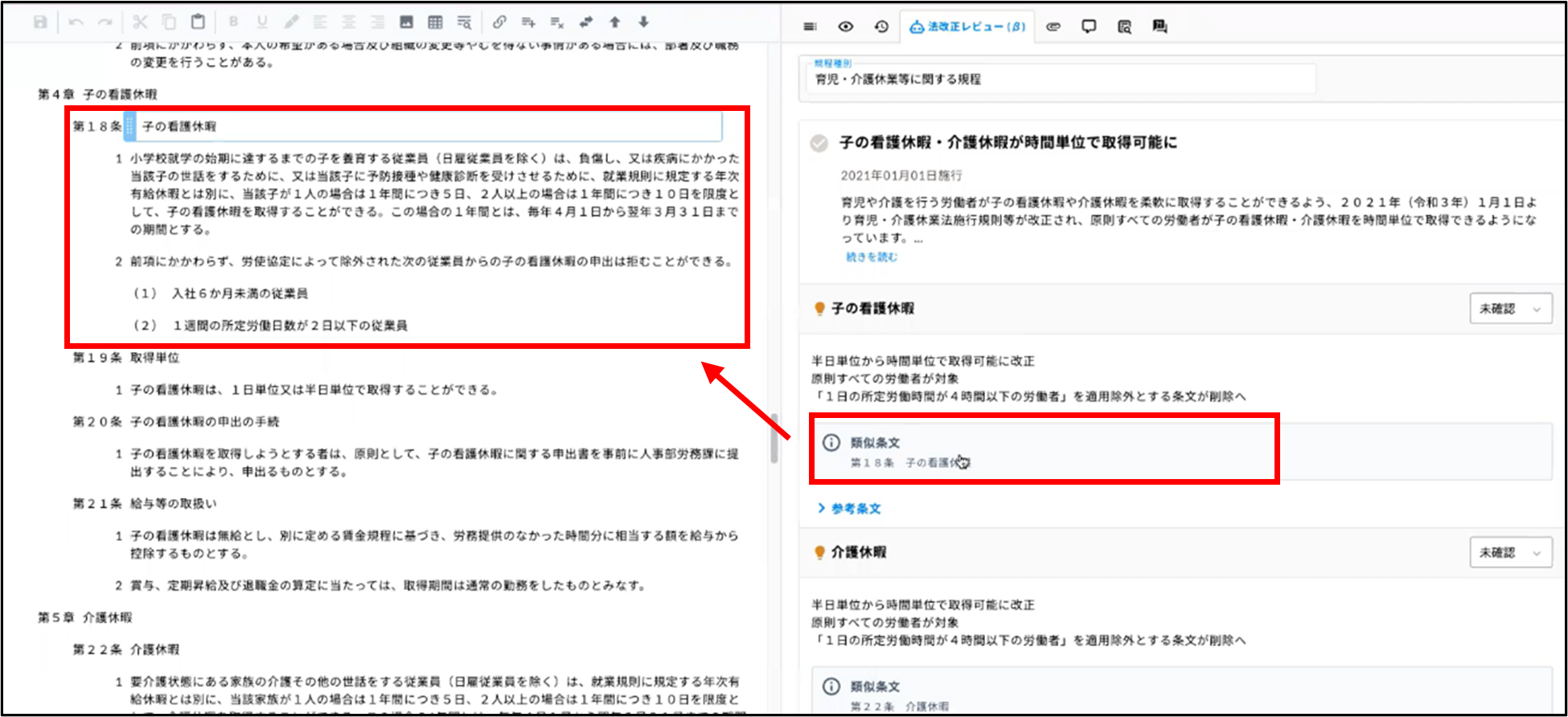 AIを活用し、既存規程に対し、法改正に関連する可能性がある条文を類似条文として表示します。改定作業が必要な場合には改定案を基に編集を行うことができます。