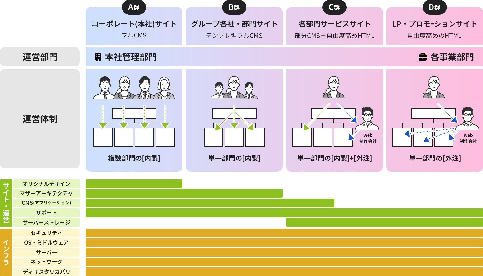 「ShareWith® 群」は、グループ会社や各事業部が管理する、運営形態が異なる多種多様なWebサイトを、現状の運営形態はほぼそのままで、ハイレベルなセキュリティを担保したクラウドプラットフォームへ、スピーディにまるごと統合することができます。クラウド化による基盤統合によってグループ全体のWebサイトのセキュリティ体制の強化に加え、ガバナンス力、内製力、ビジネス展開力を高めるとともに、IT部門が抱えるWebサイト業務の生産性向上を強力にバックアップします。