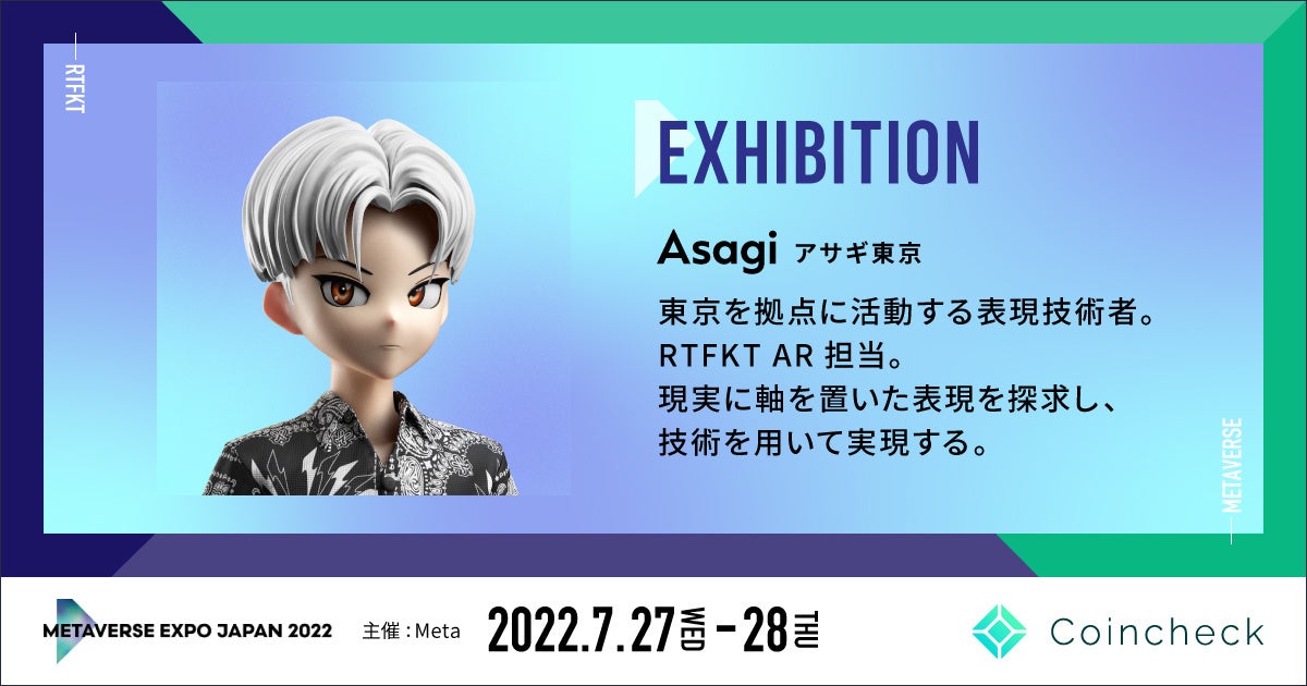 コインチェックのエキシビションブースでは、「Oasis TOKYO」を知っていただくための展示を用意しています。また、世界を代表するアーティスト村上隆氏とバーチャルスニーカーなどを手掛けるクリエイター集団「RTFKT」のコラボレーション展示「An Arrow through History」でARフィルターの制作を手がけたARアーティストのアサギ東京氏がプロデュース。来場した方がメタバース都市「Oasis TOKYO」の世界観を体験できるようなARフィルターも用意しています。